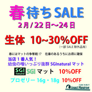 INFORMATION お知らせ 新着記事 2025.12.01 臨時休業のお知らせ 2025.11.29 12月の営業案内 2025.11.16 ブラックフライデーSALEのご案内 2025.11.01 11月の営業案内 2025.10.27 ハロウィン袋 販売 カテゴリ お知らせ 営業日時 ブログ 1号よもやま話 イベント カブトムシ クワガタ 店舗イベント 日常 昆虫マット 標本 飼育 アーカイブ 2025年12月 2025年11月 2025年10月 2025年9月 2025年8月 2025年7月 2025年6月 2025年5月 2025年4月 2025年3月 2025年2月 2025年1月 2025.02.15 お知らせ店舗イベント 春待ちSALE 2年ぶり 春待ちSALE開催のご案内 昨シーズンは暖冬で、春が待ち遠しくなる気分もないまま、早春を迎えたような気がします。今年は2月に入ってぐぐっと冷え込み雪も積もり連日寒い日々、早く春が来ないかなぁって思いますよね。 恒例「春待ちSALE」を今年は開催いたします。 期間:2月22日(土曜)〜24日(月祝日)各日13時〜19時(ご入店は18時40分まで) 生体販売 10%〜30%OFFSGI naturalマット 10%OFFプロゼリー 16g・18g 袋入り 10%OFF 生体は一部セール除外品もございます。30%以上の割引の生体もあるかも! マットとゼリーにつきましては、在庫限りとなります。 ぜひ、春待ちSALEで、お得にゲット! 皆様のお越しをお待ちしております。