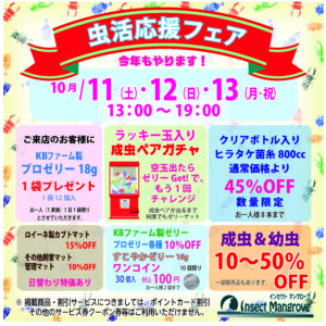 INFORMATION お知らせ 新着記事 2025.10.04 ✨虫活応援フェア✨開催 2025.09.26 10月の営業案内 2025.09.12 じゃんけん割引 2025.08.30 [更新] 9月の営業案内 2025.08.24 臨時休業のお知らせ カテゴリ お知らせ 営業日時 ブログ 1号よもやま話 イベント カブトムシ クワガタ 店舗イベント 日常 昆虫マット 標本 飼育 アーカイブ 2025年10月 2025年9月 2025年8月 2025年7月 2025年6月 2025年5月 2025年4月 2025年3月 2025年2月 2025年1月 2024年12月 2024年11月 2025.10.04 お知らせ店舗イベント ✨虫活応援フェア✨開催 今年もめちゃお得な3日間「虫活応援フェア」開催 お得なポイント盛沢山 ⭕ご来店先着100名様 KBファーム製プロゼリー18gプレゼント🎁 プロゼリー18g 12個入袋お一人様(1家族様)1袋プレゼント/日 ⭕成虫&幼虫 10%〜50% 割引セール! フェアに合わせて成虫ペアを多数陳列いたします! ⭕ヒラタケ菌糸クリアボトル 45%OFF 通常価格より45%OFF 数量限定無くなり次第終了となります。お一人様 8本まで ⭕ワンコインセール復活!KBファーム製すこやかゼリー税込100円 すこやかゼリー30個入り1袋 税込100円数量限定 10袋限り お一人様(1家族様)2袋まで ⭕ロイーネカブトマット 15%OFF 通常価格から15%OFF 在庫限り お一人様3袋まで ⭕KBファームプロゼリー 袋入 各種 10%OFF 通常価格から10%OFF 在庫限り ⭕成虫管理マット 10%OFF 通常価格から15%OFF 在庫限り ⭕日替わり特価! 飼育用品 日替わりで何かがめちゃお得に!数量限定でびっくり価格に日替わりは店舗にて 何が特価になるか、お楽しみ。 ⭕ラッキー玉入 成虫ペアガチャ開催 通常のガチャより断然🉐 ラッキー玉とは=サービスゼリーが貰えちゃう!ラッキー玉が出るほどお得に!ラッキー玉が出たらもう1回ガチャを回して成虫ペアゲット!ガチャの詳細は 数日後に「お知らせ欄」に発表いたします。 皆様のお越しをお待ちしております!