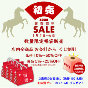 INFORMATION お知らせ 新着記事 2025.12.23 2026年初売りのご案内 2025.12.18 クリスマスセールのご案内 2025.12.01 臨時休業のお知らせ 2025.11.29 12月の営業案内 2025.11.16 ブラックフライデーSALEのご案内 カテゴリ お知らせ 営業日時 ブログ 1号よもやま話 イベント カブトムシ クワガタ 店舗イベント 日常 昆虫マット 標本 飼育 アーカイブ 2025年12月 2025年11月 2025年10月 2025年9月 2025年8月 2025年7月 2025年6月 2025年5月 2025年4月 2025年3月 2025年2月 2025年1月 2025.12.23 お知らせ店舗イベント 2026年初売りのご案内 2026年 新春 初売りのご案内 今年も残すところ数日、師匠も走るほど忙しい年末ですね。さて、年明けの初売りのご案内です。 2026年1月2日13:00より初売りいたします。 期間:1月2日(金曜日)〜1月4日(日曜帯) ご来店者様へ「お年賀」としてゼリーを進呈させていただきます。 先着100名様限りとなりますが、年明け早々にご来店いただいた事への感謝と、この1年のご挨拶を兼ねてKBファーム製プロゼリーをわずかな数となりますが、進呈させていただきます。 数量限定 福袋の販売 来年の初売りも福袋を販売いたします。もちろん、今回も「店長暴走福袋」の販売もあります。福袋の内容は、後日このHPお知らせ欄にて公表いたします。もうしばらくお待ちください。 店内全商品がセールの対象となります。 店内のすべての商品が割引対象となります。(書籍と福袋は除く)割引率は、お会計時にくじ引きで決定します。 生体ご購入の場合:10%〜50%OFF 生体以外の用品類の場合:5%〜25%OFF 年初めの「くじ運」試しですね。 初売りは3日間ですが、店休み明けの3連休に「大売りし」もいたします。詳細は後日発表 皆様のお越しを心よりお待ちしております。